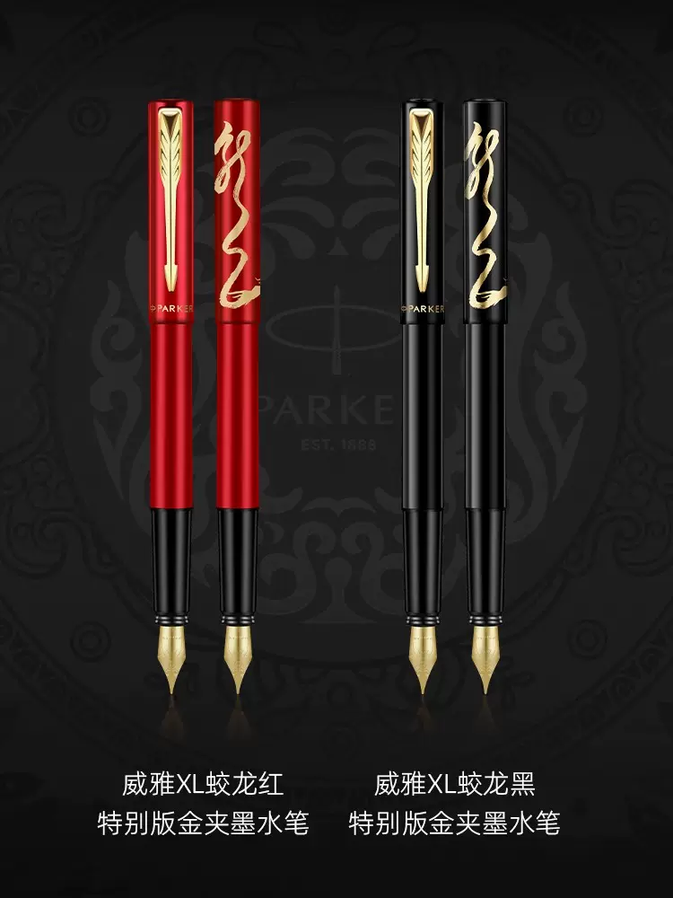 这款Parker 派克 甲辰年 御龙特别系列 威雅XL钢笔(钢杆金夹)黑金礼盒,,内含钢笔+墨水,适合送礼。PARKER 派克 威雅XL钢笔,笔上饰有派克标志性LOGO,彰显质感。PVD镀金笔尖,笔尖X型设计,优雅灵动,适合日常书写。标志性镀金箭标,经典设计箭羽笔夹,书写顺滑舒畅,PVD镀金工艺,熠熠夺目。