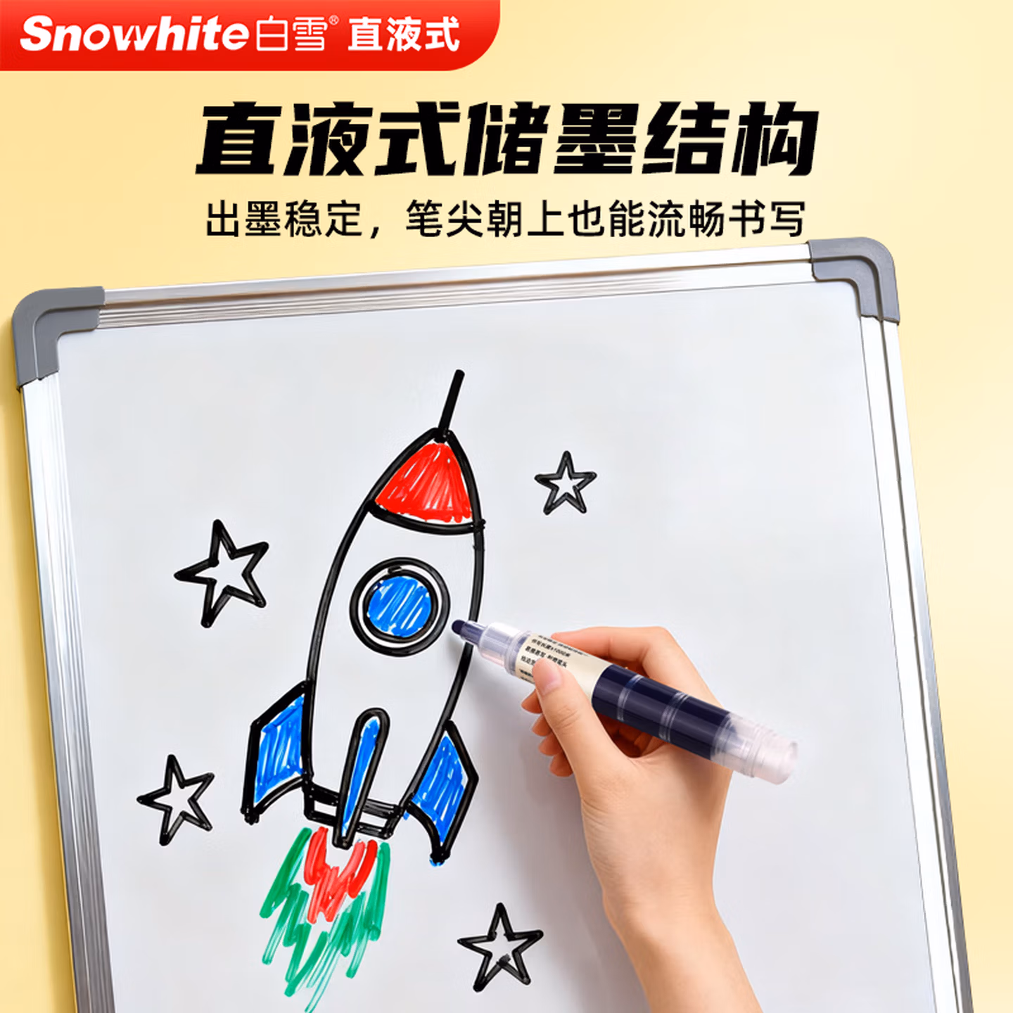 这款白雪 WB-598 直液式三仓白板笔,大容量三仓一体设计墨仓,笔杆即笔芯,书写长度1000米,是棉管白板笔的3.5倍。微控技术,平衡墨水仓内外压强,不易漏墨,更稳定。墨水特别添加保湿成分,脱帽72小时不干,正常书写。