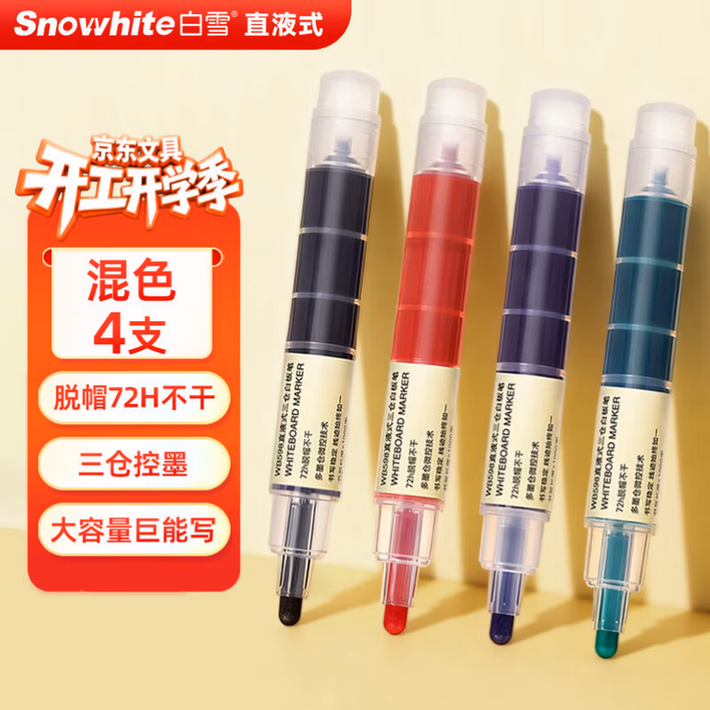 白雪(snowhite)巨能写大容量直液式三仓白板笔教师专用粗杆马克笔记号笔可擦办公用品 彩色4支WB-598,京东商城好评率99%,现售价¥14.1,凑单2件直尺参与满3件8折促销,天降9.4折限时折扣, 白板笔实付¥10.6。