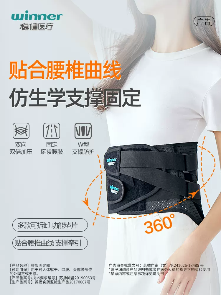 这款Winner 稳健 医用护腰带 透气款,注册证号:苏扬械备20190053号,人体仿生腰椎支撑系统,贴合腰椎26°曲线,曲线记忆钢板+仿生脊骨板(高配款配置,透气款仅采用PP支撑条)W型全方位支撑防护,交叉式双重双向加压系统,密集蜂巢式网孔,弹力透气不闷热,强韧魔术贴,沾附力强,稳固粘合。