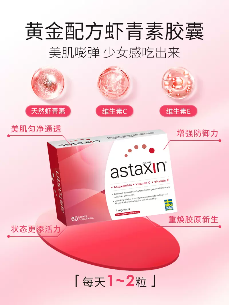 这款Astaxin 虾青素软胶囊,产地瑞典,瑞典国家滑雪队指定品牌。提取自天然雨生红球藻,每粒含有虾青素4mg ,具备超强抗氧化性,能清除体内自由基,延缓衰老。抵抗紫外线辐射,增强皮肤免疫力。缓解运动疲劳,防止肌肉和骨骼酸痛。减轻风湿性关节炎疼痛。有效改善近视、假性近视及视网膜病变引起的眼部疾病。