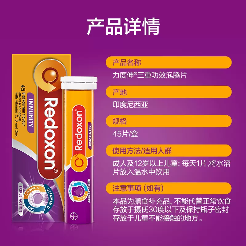 这款Redoxon 力度伸 维生素C泡腾片,拜耳医药出品,是维生素类非处方药药品,每片含1000mg维生素C、10mcg维生素D及10mg锌。