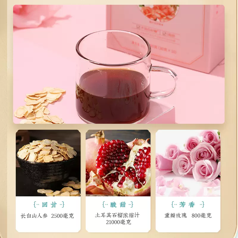 这款童涵春堂 石榴玫瑰人参饮,上海中医药大学中药学院合作研发,透明干净生产现代先进技术生产。土耳其石榴,长白山人参,重瓣红玫瑰为原料制作,富含花青素和红石榴多酚、鞣花酸,多元酚等活性成分, 含人参皂基Rg1,Rb1,Rg3等。0香精,0色素,0防腐剂,0白砂糖。开袋即可饮用,能量满满。