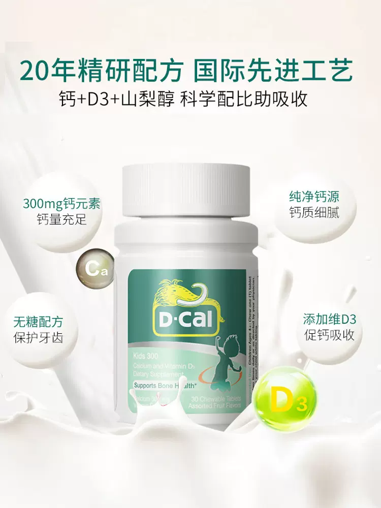 这款D·Cal 迪巧 儿童钙维D咀嚼片,产地美国,适合3岁以上儿童,每片含钙300mg,美国加利福尼亚的稀有“细腻碳酸钙源,添加维生素D3,有助于钙的吸收。桃子、菠萝、橙子三种果味可爱大象形钙片,好吃又好玩,让孩子爱上补钙,每天一颗,助力宝宝骨骼成长。