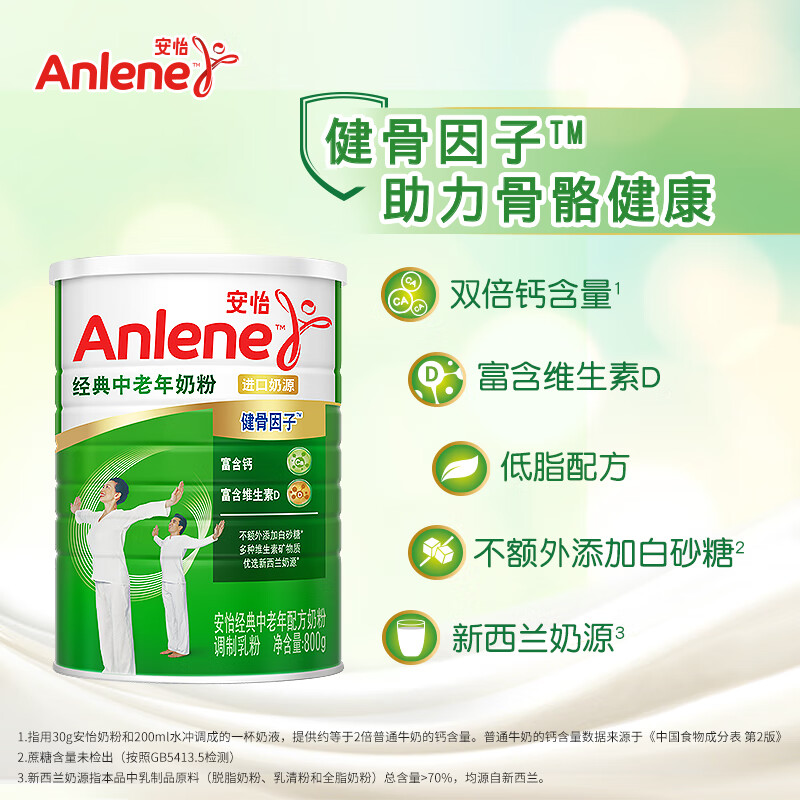 这款Anlene 安怡 经典中老年奶粉 ,来自新西兰的乳业集团Fonterra恒天然,是一款适合中年和老年用户 的专用奶粉。新西兰奶源,有骨骼营养强化配方,专为有补钙及低热量需求的用户定制富含维生素D,添加细小微钙粒子,100g奶粉含脂肪2.8g, 1杯安怡含有2倍普通牛奶的钙质。含有多种维生素和矿物质,不添加白砂糖,安全、健康,适合中老年人饮用。