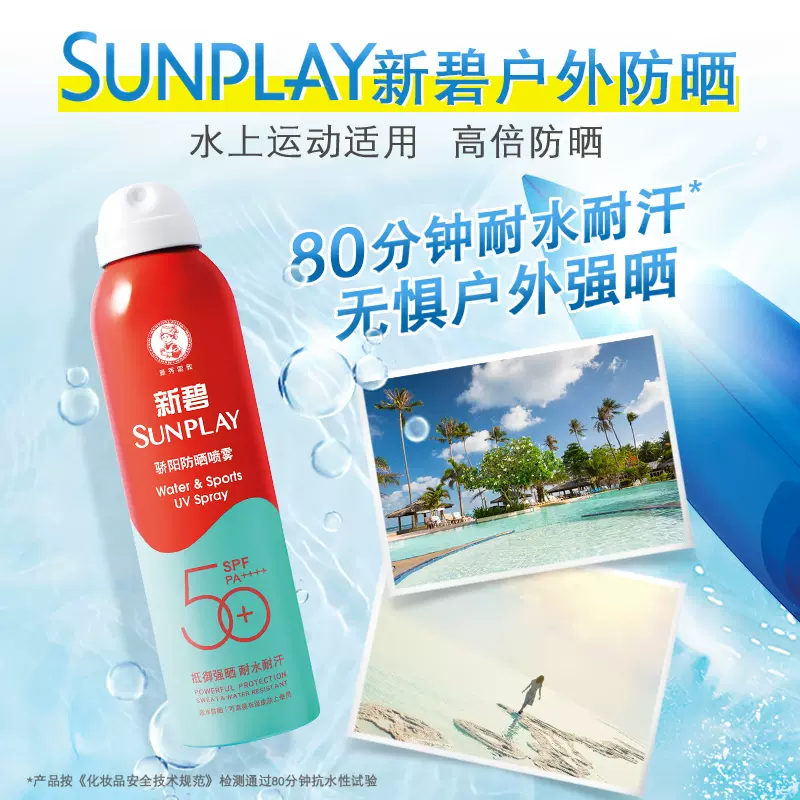 这款Mentholatum 曼秀雷敦 Sunplay 新碧 骄阳防晒喷雾,80分钟耐水耐汗,无惧户外强晒。防晒指数SPF50+ PA++++,SOLAREX-3三重护肤级防晒技术,打造护肤级防晒,多种防晒成分组合,打造多波段防护。水润保湿,有效对抗因紫外线引起的干燥粗糙等肌肤问题。添加透明质酸钠防止,日晒造成水分流失。护肤级养肤,有效晒后呵护。