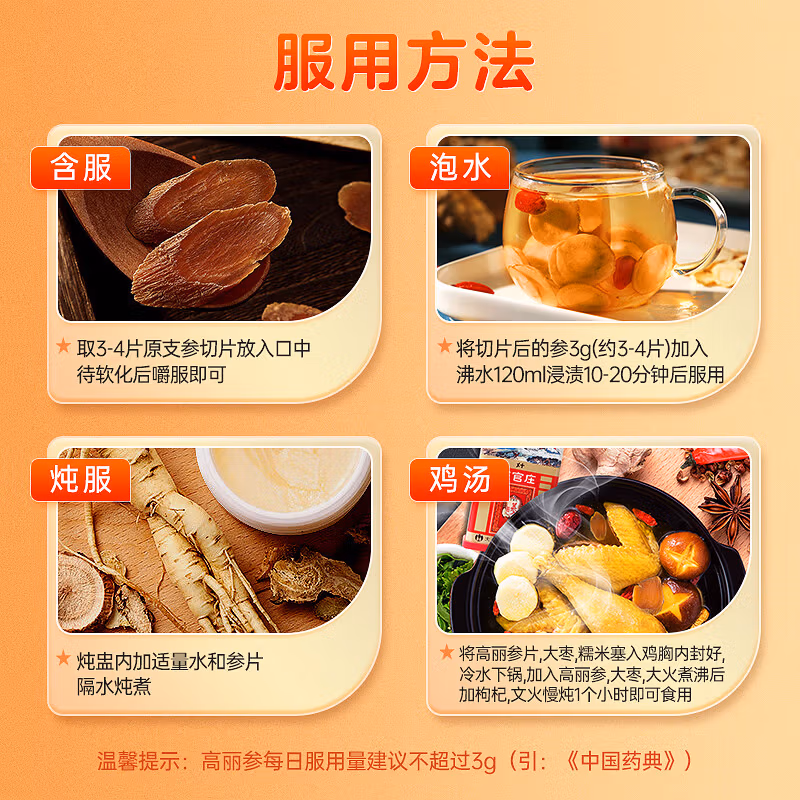 “正官庄”高丽蔘可分为天、地、良、切四个等级。正官庄牌 高丽红参6年根人参[良字],6年根高丽参,富含32种皂苷,特别适合熬夜党,手机电脑党,抵抗力低的人群。