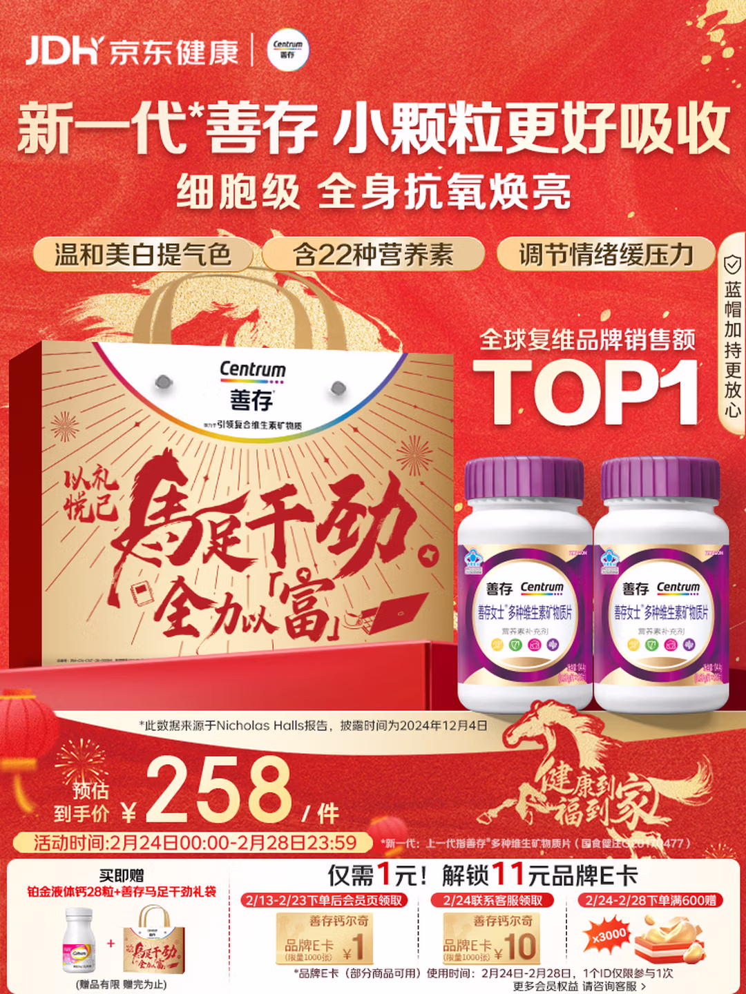 这款Centrum 善存 男士复合维生素 升级小蓝瓶, 22种营养协同复配,优质原料,根源提升吸收率,维生素K2吸收率+10倍,中性维生素C吸收率+1.5倍,肠胃友好,适合消化不良人群。富硒酵母吸收率+1.88倍,富马酸亚铁有机铁,成分稳定肠胃刺激较小。足量六大B族维生素 ,帮助能量代谢、减轻熬夜、压力带来的疲劳。维生素 C、E 协同抗氧化;锌、硒针对男性生殖健康与免疫。