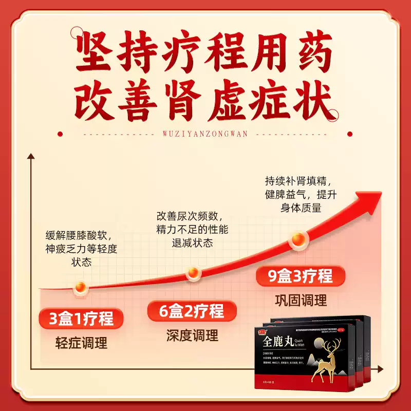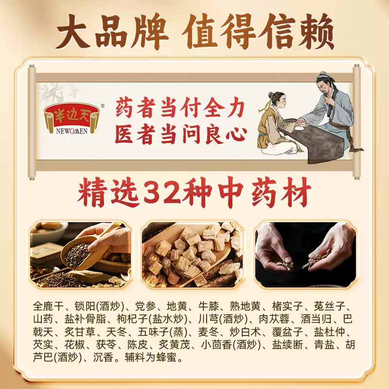这款半边天 全鹿丸,国药OTC,全鹿干、锁阳(酒炒)、党参、地黄、牛膝、熟地黄、实子、菟丝子、山药、盐补骨脂、枸杞子(盐水炒)、川芎(酒炒)、肉苁蓉、酒当归、巴戟天、炙甘草、天冬、五味子(蒸)、麦冬、炒白术、覆盆子、盐杜仲、芡实、花椒、获苓、陈皮、炙黄茂、小茴香(酒炒)、盐续断、青盐、胡芦巴(酒炒)、沉香为原料 ,辅料为蜂蜜,遵古炮制。可补肾填精,健脾益气。用于脾肾两亏所致的:老年腰膝疲软、神疲乏力、畏寒肢冷、尿次频数、带下。
