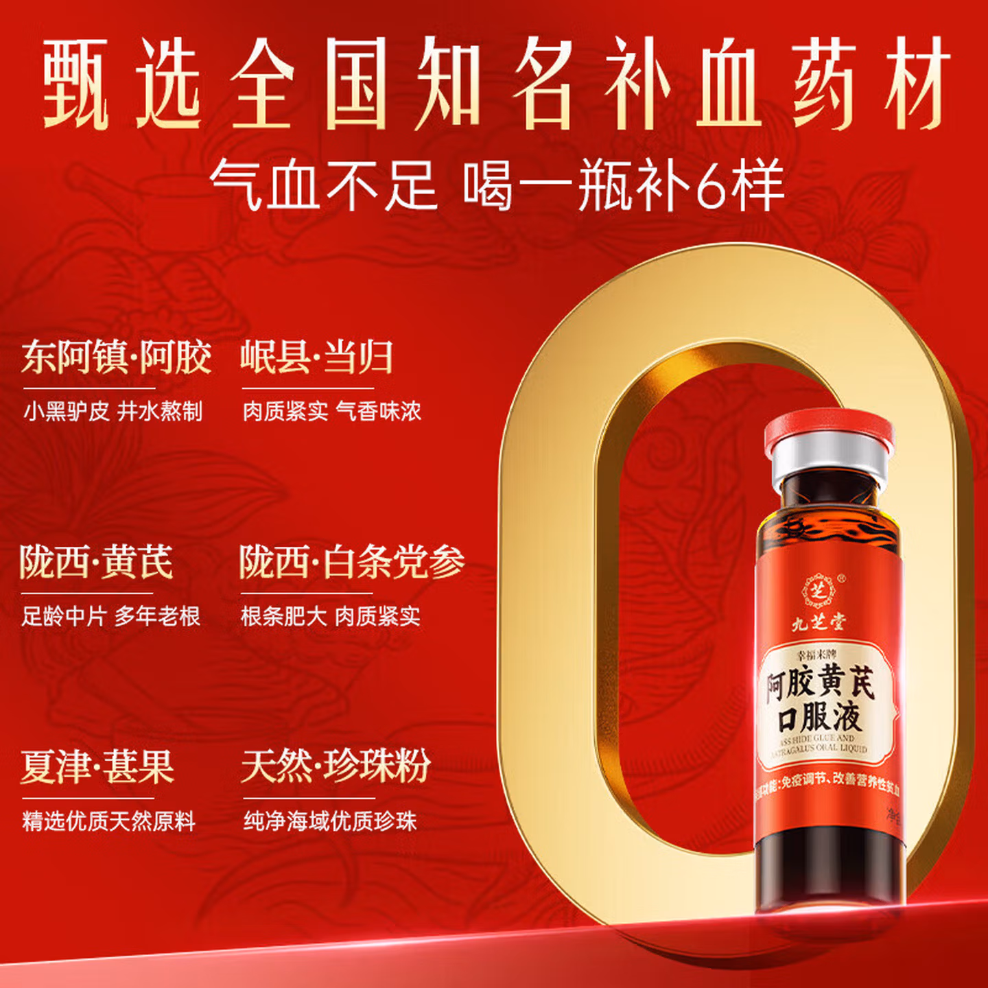 这款九芝堂 幸福来牌 阿胶黄芪口服液 ,国家CFDA权威认证,6重精粹改善贫血,东阿镇阿胶补血圣品,滋阴润燥。陇西黄芪固本止汗,补气益血。岷县当归血活调经,健脾养心。夏津桑葚果补血滋阴,清肠润燥。陇西白条党参补中益气,养血生津。天然珍珠粉安神明目、润肤祛斑,总皂苷含量52.8mg。高倍浓缩小分子口服液制剂,人体吸收更快,作用更快,0蔗糖添加。