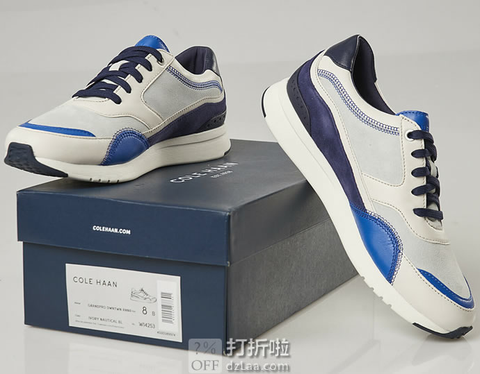 Cole Haan Women's Grandpro Downtown Runner Sneaker 可汗 女式板鞋 休闲鞋,美国亚马逊4.4星好评。原价$150,现Ivory Nautical Blue Maritime Blue Leather/Morning Mist &Marine Blue Suede/Optic White配色5.5码降至2.3折(国内35.5码)。