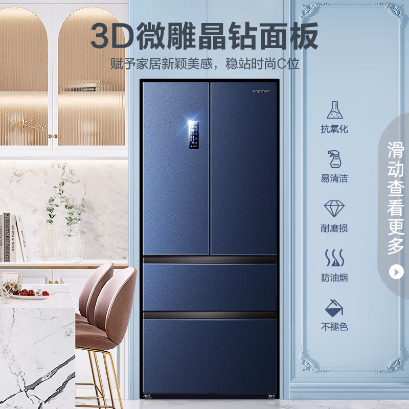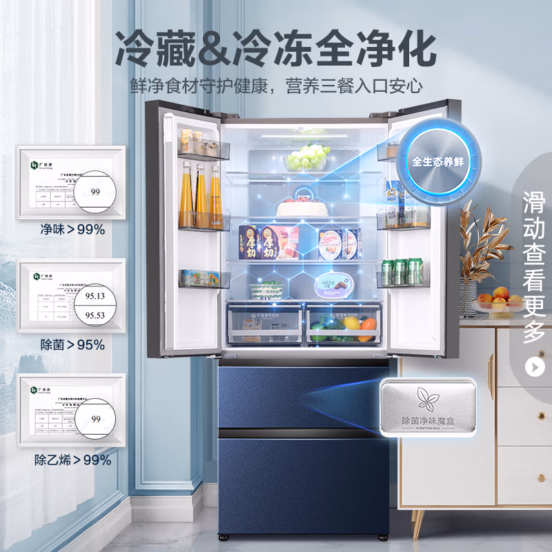 这款Ronshen 容声 水蓝光系列PRO款 法式四门冰箱 BCD-520WD17MP 520升,全系采用晶钻外观设计,3D立体微雕工艺,触感细腻,美观耐用。搭载矢量变频压缩机+一体式变频离心风机组合,高效节能,静音效果更好,综合耗电低至0.82~0.86kw/天,符合一级能效标准,拥有7~8kg/12h强冷冻能力。采用全空间思维净化技术,楚君丽高达95%以上,异味分解率超过98%,乙烯分解率>85%,实现除菌、净味、除乙烯三合一。
