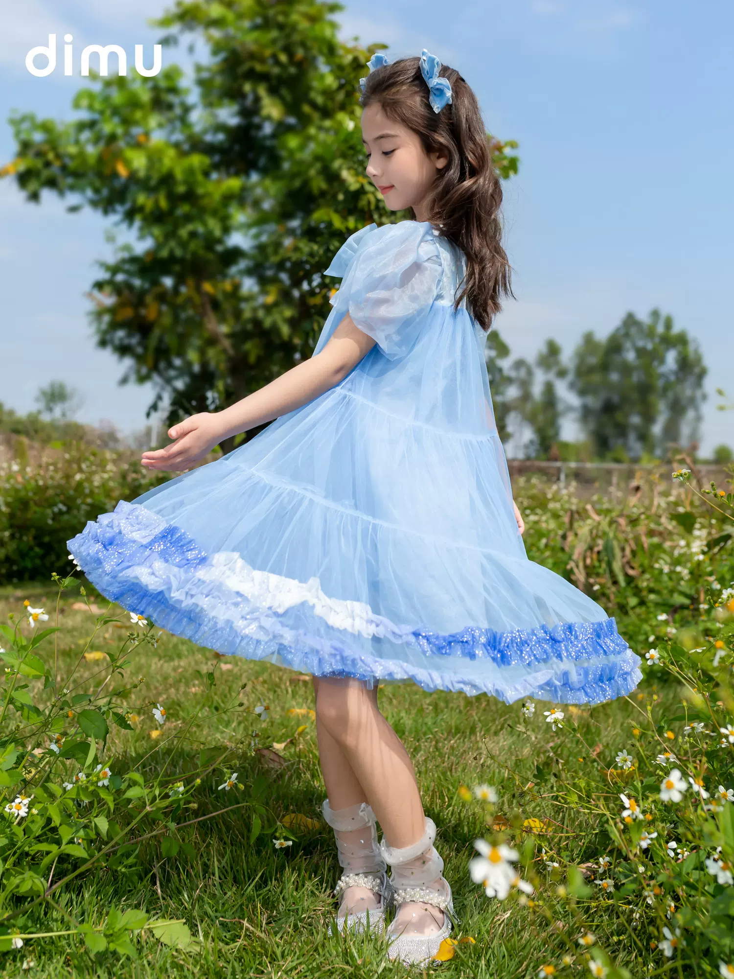 这款笛牧 23年夏季新款 女童爱莎公主裙,层叠淡蓝色轻纱,拼接渐变深蓝色亮片木耳边,就好像夜晚在海边戏水的女孩,浪花溅起洒在她飘舞的裙摆上,将淡蓝色的裙摆染上大海的深蓝,星光附下洒在裙摆上,点亮每个女孩的成长之路。