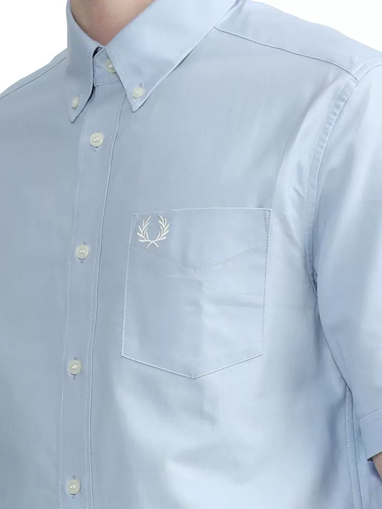这款Fred Perry 佛莱德·派瑞 23年夏季款 男式短袖衬衫 M3027,100%全棉面料,吸湿透气。经典设计,简约纯色。尖领扣领,彰显绅士魅力,领边车线缝制,多次机洗不易变形。左胸前有品牌刺绣标识,简约低调。