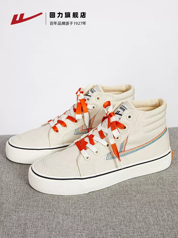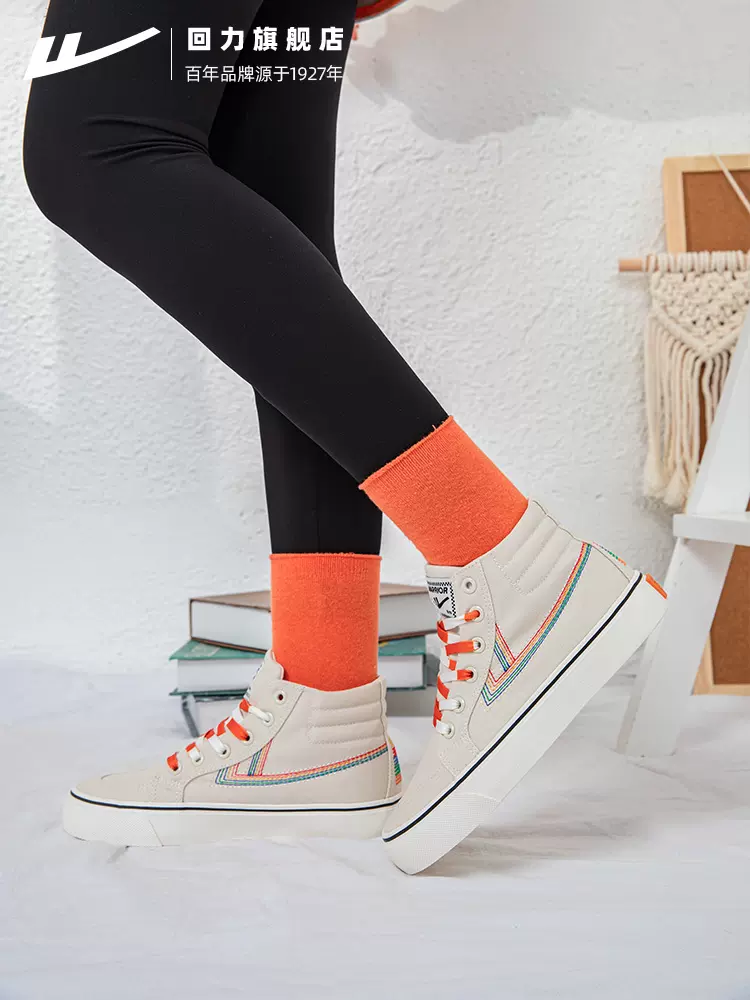 这款回力 小脏橘 女式高帮帆布鞋 ,回力经典鞋型,标志性LOGO装饰,帆布面料,手感柔软舒适,干爽透气。鞋底采用橡胶材质,抓地力强,耐磨又耐穿,乳胶鞋垫,柔软护足,包边圆弧防撞鞋头,有效缓解正面撞击和挤压,保护足尖,缝制彩虹F标logo。细节点缀,增加层次感,出街吸引目光,鞋面与鞋带撞色拼接,新潮又时尚。