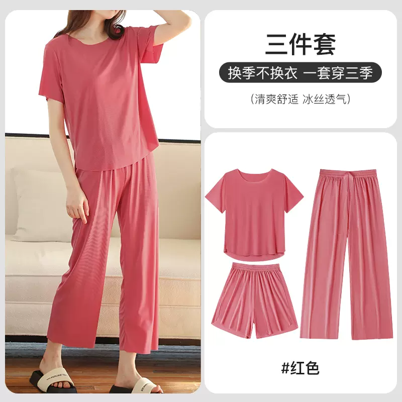 宝娜斯 23年夏季款 女式冰丝短袖家居服3件套 SY2301-1,现天猫bonas宝娜斯专卖店售价¥49.9,可领取¥10天猫优惠券,折后¥39.9包邮。点此搜索更多天猫/淘宝优惠券。 这款宝娜斯 23年夏季款 女式冰丝短袖家居服3件套,均码,80~140斤都可穿,冰丝面料,轻盈透气,凉感速干;无痕圆领设计,修饰肩颈线条,穿脱不费力,零感亲肤;高弹松紧腰,拉伸回弹大,无束缚。宽松直筒裤脚,软软冰爽。