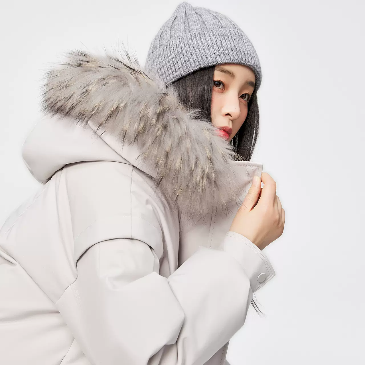 这款Snow Flying 雪中飞 女式短款毛领羽绒服 ,高密聚酯面料,内里填充物为鸭绒,含绒量90%,17cm蓬松度,轻盈保暖,穿着无负担,4层高密锁绒,防钻绒。可拆卸貉子大毛领,时尚又保暖。防风袖口,不惧冬日严寒