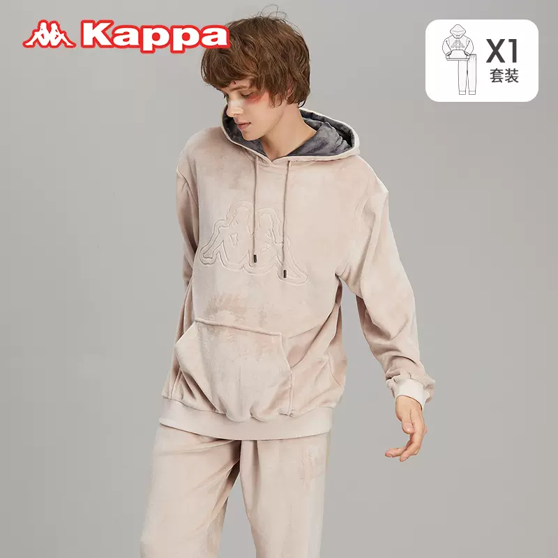 Kappa 情侣法兰绒保暖家居服套装 ,双面法兰绒材质,大连帽设计,加倍保暖;单排扣设计,系扣更窂锁温;弹力松紧袖口,不勒腕很舒适;大容量贴袋,解放双手;高弹松紧腰头,不勒腰,嵌条装饰脚口,彰显品质。