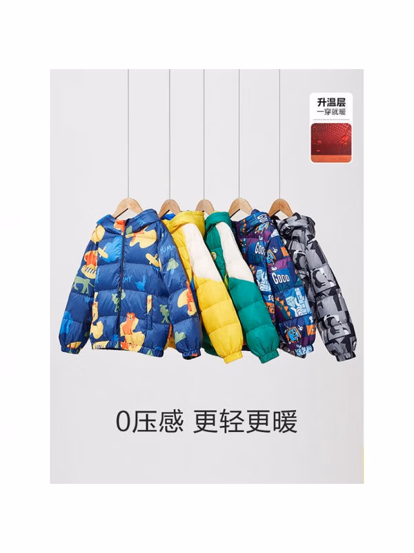 这款MQD 马骑顿 儿童轻薄羽绒服 ,锦纶/尼龙面料,内部填充90%白鸭绒,0压感,轻薄且保暖,卡通印花图案很有童趣,拉链开合,连帽设计,松紧袖口和下摆,防风保暖。