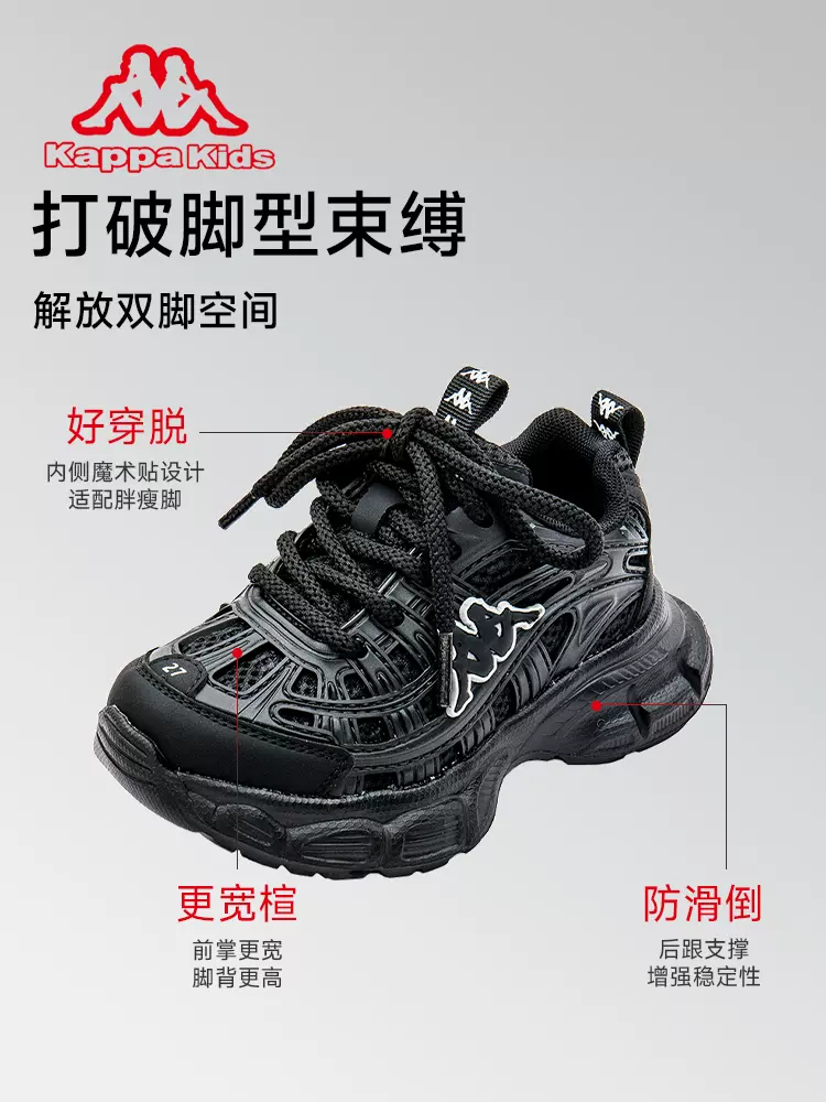 这款kappa kids 黑武士 儿童老爹鞋,环保织物鞋面,材质亲肤舒适,触感柔和。专业童鞋楦头,前掌更宽,脚背更高,解放双脚空间。内侧魔术贴设计,方便穿脱。1/3人体工学合理弯曲设计,防止足弓变形,告别扁平足。加固后跟杯,稳定脚踝脚丫,避免足外翻,柔软根骨,健康发育。;减震轻弹中底,缓震不伤膝盖。