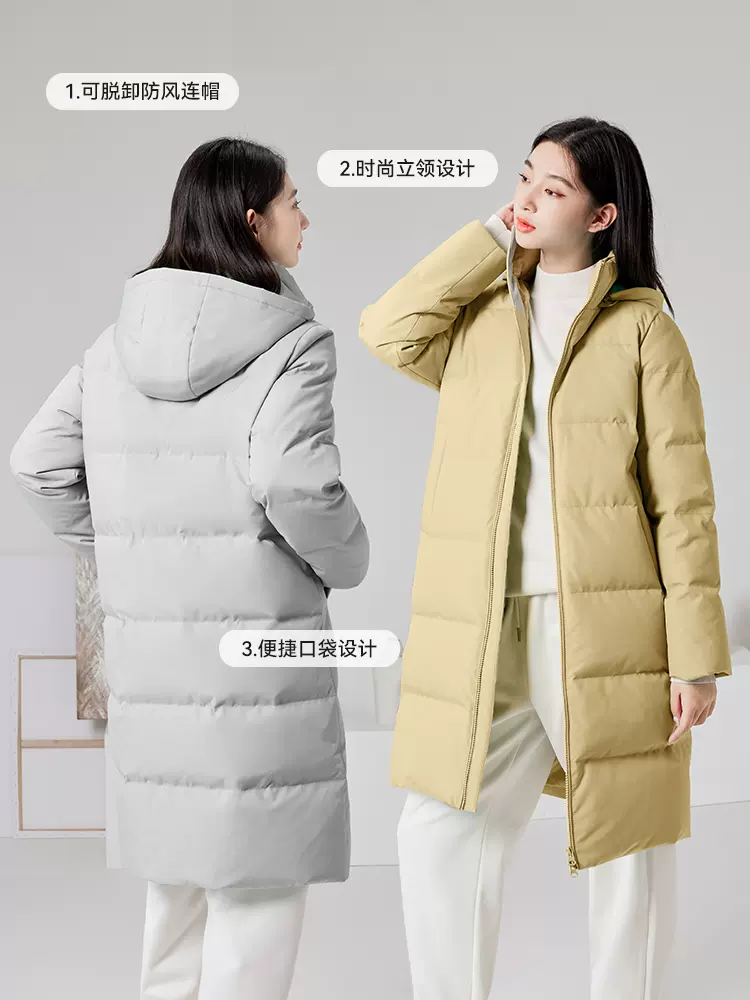 这款Snow Flying 雪中飞 女式廓形连帽中长款羽绒服, 本真色系与质感面料带来温暖守护,简约廓形结合几何切线设计,兼顾美学与实用。工艺门襟,立领防风防寒。可拆卸连帽,兼具保暖实用功能。高密优选面料具有轻微防泼水效果,填充85%鸭绒,620+蓬松度,清洁无异味。厚而不肿,暖而有型。