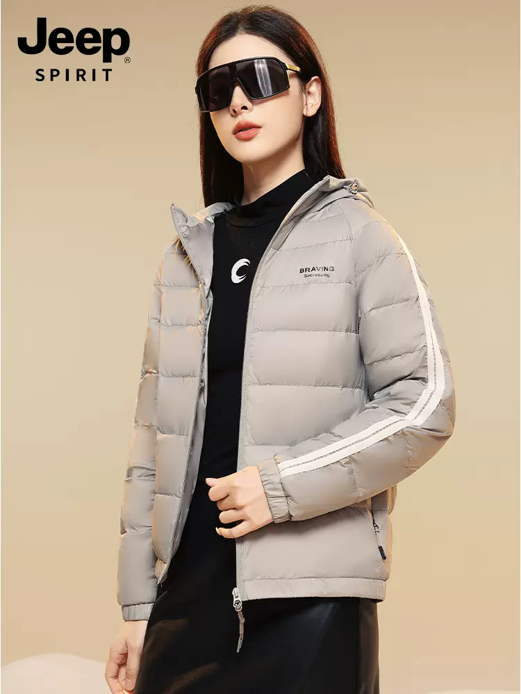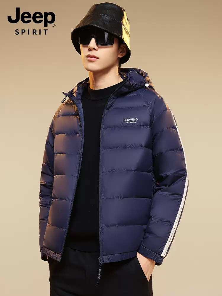这款Jeep Spirit 23年秋季款 轻便保暖羽绒,品质面料,穿着顺滑温润,柔软舒适,表面细密均匀,质感平整,新国标鸭绒,分格充绒,90%含绒量,高密胆布防跑绒,高品质拉链门襟,弹力袖口,两侧拉链口袋。