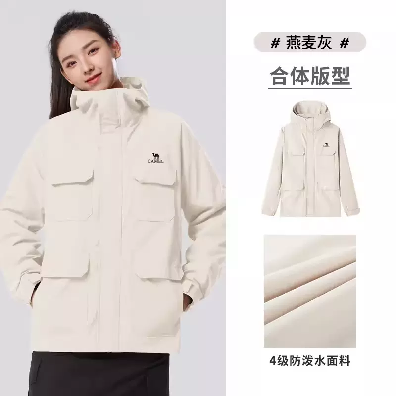 这款Camel 骆驼23年秋季 情侣款 加绒工装夹克外套,4级拒水防泼科技面料,75D*150D高密支数T800平纹面层,柔韧且耐撕裂;不可拆卸风帽,时刻为你遮风挡雨,加高至12CM立领,有风度更有温度;多口袋元素,凌冽切角设计,让收纳变很酷。