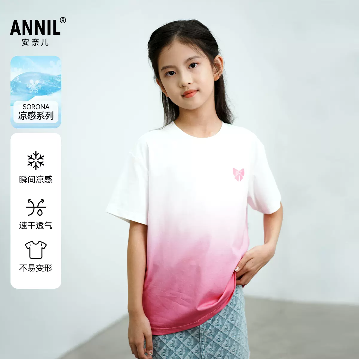 这款Annil 安奈儿 24年夏季款 女童爱心渐变速干短袖T恤,SORONA记忆棉凉感面料,清凉滑爽不易变形,甜趣渐变色童年更出色。