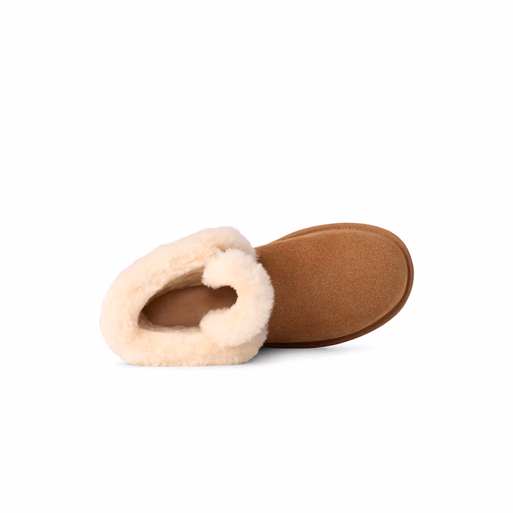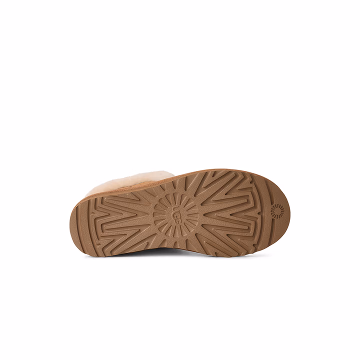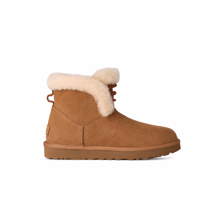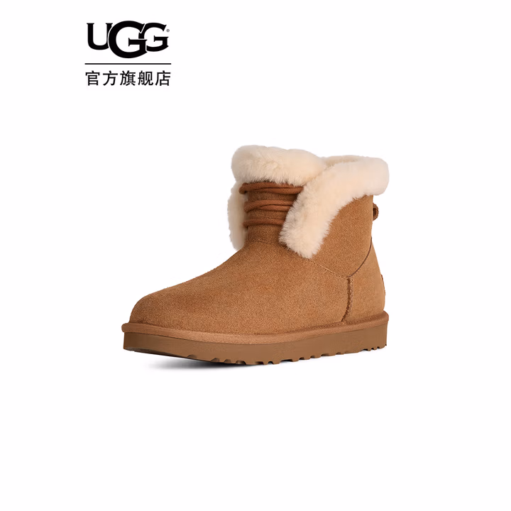 UGG 25年秋季款 经典新奇系列mini波西 女式雪地靴 1174576 ,牛剖层革翻毛皮鞋面,棉质系带细节点缀,适配多种脚型穿着。约10毫米羊毛皮鞋领,约17毫米UGGplush™里衬、鞋垫,保暖舒适。约12.5厘米靴筒,EVA外底,轻便舒适。