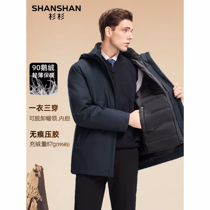 SHANSHAN杉杉鹅绒羽绒服男中长款男士一衣五穿可拆卸连帽内胆保暖御寒外套,京东商城好评率94%,现SHANSHAN杉杉男装旗舰店售价¥629元,满1件打6.5折,领取¥100京东优惠券,¥29京东优惠券, Plus会员领¥500-50补贴券 Plus会员实付¥¥229.37包邮。