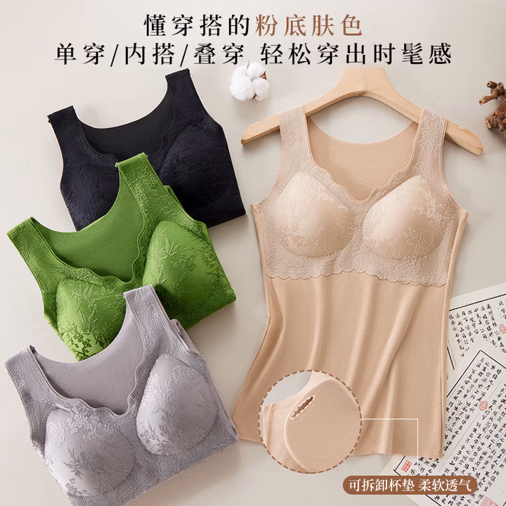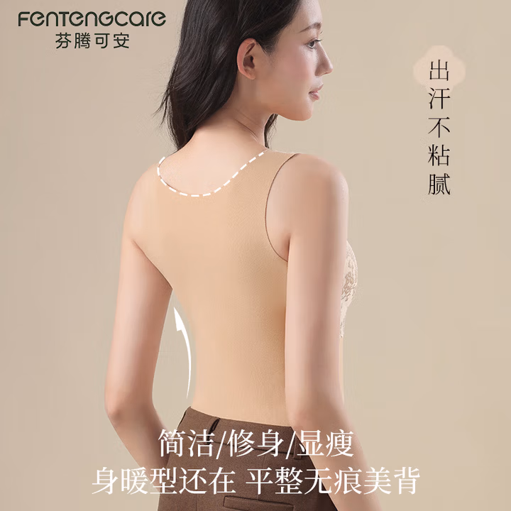 这款芬腾可安 25年冬季新款 女式打底保暖背心 FTKA8930 ,融合新中式美学,精密刺绣竹叶设计 。阳离子双面磨毛,暖呼呼过秋冬。软支撑,上托防下垂。自带Bra隐形是衣橱的穿搭伴侣。可拆卸杯垫,机洗不跑杯。上身直接隐形,真正适合亚洲肤色,像给胸部打了一层柔焦粉底液。