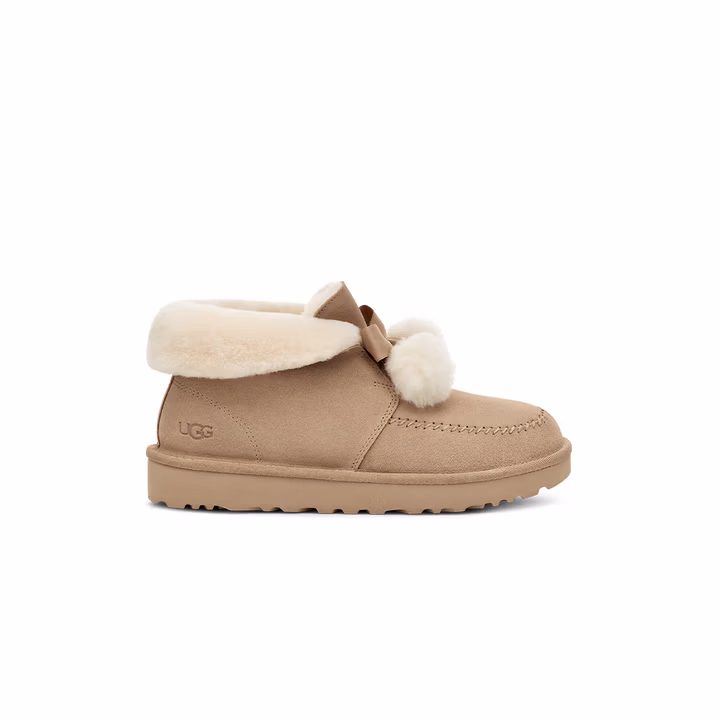 这款UGG 25年秋季新款 kallenⅡ 凯琳2.0 蝴蝶结翻折鞋口女式毛毛鞋雪地靴 1153517, 牛剖层革翻毛皮鞋面,再生聚酯纤维滚边。约10毫米羊皮毛里衬,约17毫米UGGplush™ 鞋垫,可翻折式羊皮毛鞋领,保暖舒适。固定蝴蝶结,羊皮毛毛球装饰,俏皮可爱。塑膜橡胶外底,轻便防滑。