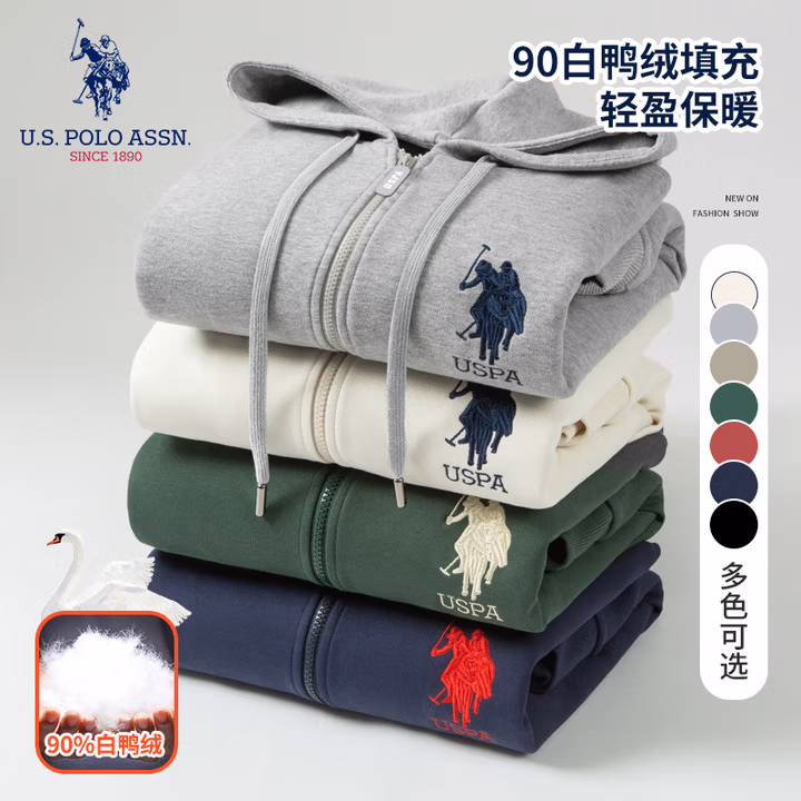 这款U.S. Polo Assn. 美国马球协会 男式连帽羽绒卫衣 SQ-US23JK317, 25年冬季新款,小米尼面料, 聚热蜂窝内胆,填充90%白鸭绒,蓬松度600蓬,抽绳调节连帽拉链门襟,双侧插手袋设计,胸前品牌刺绣LOGO。