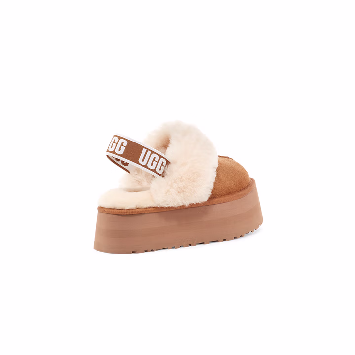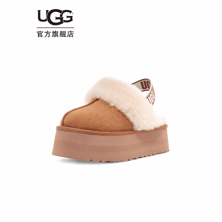 这款UGG Funkette 方克特 厚底LOGO松紧带 女式懒人毛毛鞋 1113474,舒适一脚蹬款式,牛剖层革翻毛皮鞋面,羊皮毛鞋领。约10毫米羊皮毛内衬、内底,保暖舒适。再生聚酯纤维织物滚边,约5厘米厚EVA外底,慵懒自在出街。后跟弹力带品牌徽标松紧带,穿脱方便。
