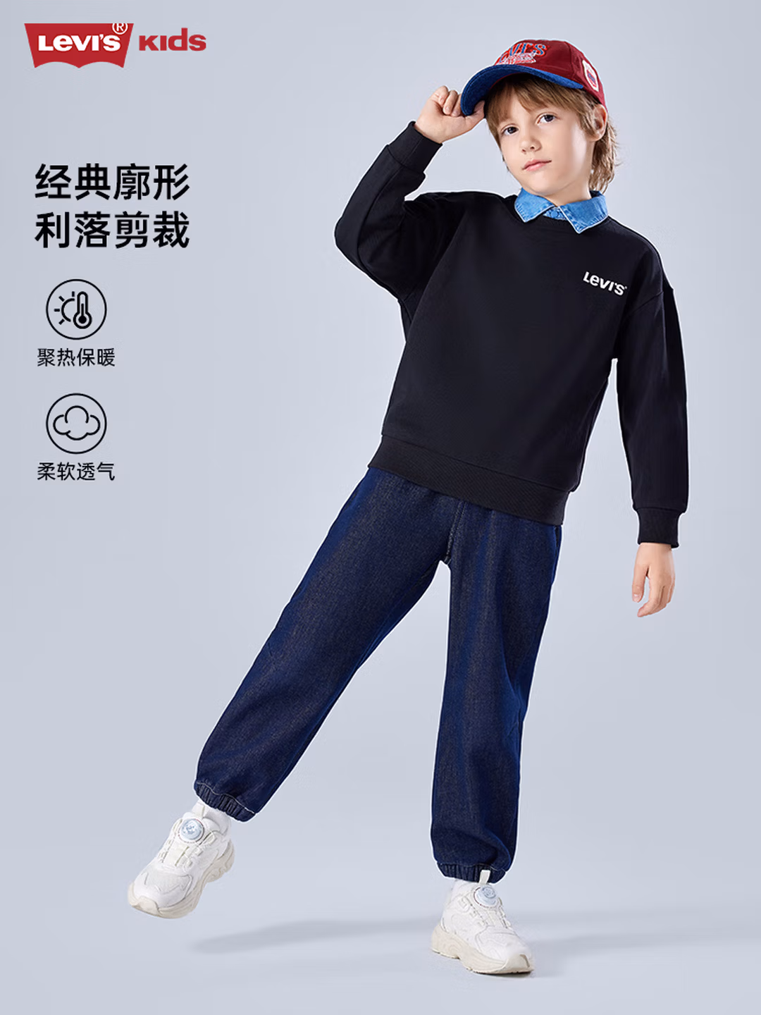 Levi's【加绒】李维斯儿童童装卫衣2025新款字母圆领男童长袖上衣,京东商城好评率100%,现Levi's童装旗舰店售价¥162,可领取 5折京东优惠券, 实付¥81包邮。 Levi's 李维斯 2025年冬季新款 加绒儿童套头卫衣 LV2542529GS-001 ,经典廓形,利落剪裁,280G涤棉底摇粒底绒布面料,保暖舒适。罗纹包边圆领,不易变形。罗纹包边袖口,稳固包裹,防风侵入。后背彩色小车图案,打造吸睛背影。