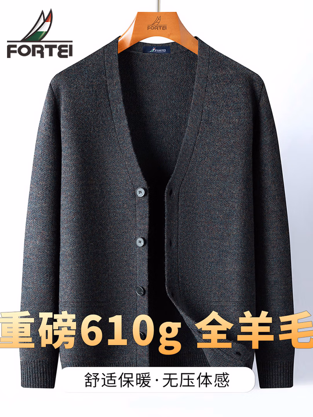 这款Fortei 富铤 男式羊毛开衫外套,100%绵羊毛面料,高密编制,整件610g重磅克重,手感丰满蓬松,保暖性佳。V领单排扣开襟,做工精湛,肩部缝纫工整,挺括有型,不失格调。罗纹袖口,舒适有弹,活动自如无束缚感。