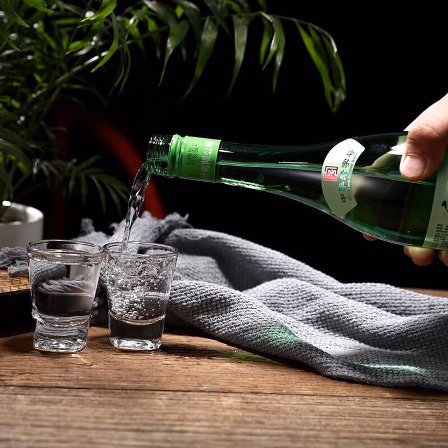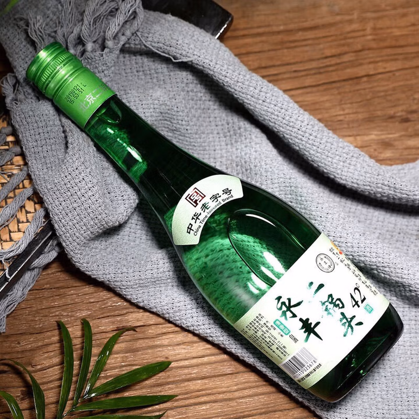 永丰牌 北京二锅头 清雅绿波 42度清香型白酒,执行标准:GB/T10781.2-2022(一级),高梁,玉米,大麦,豌豆为原料酿制。