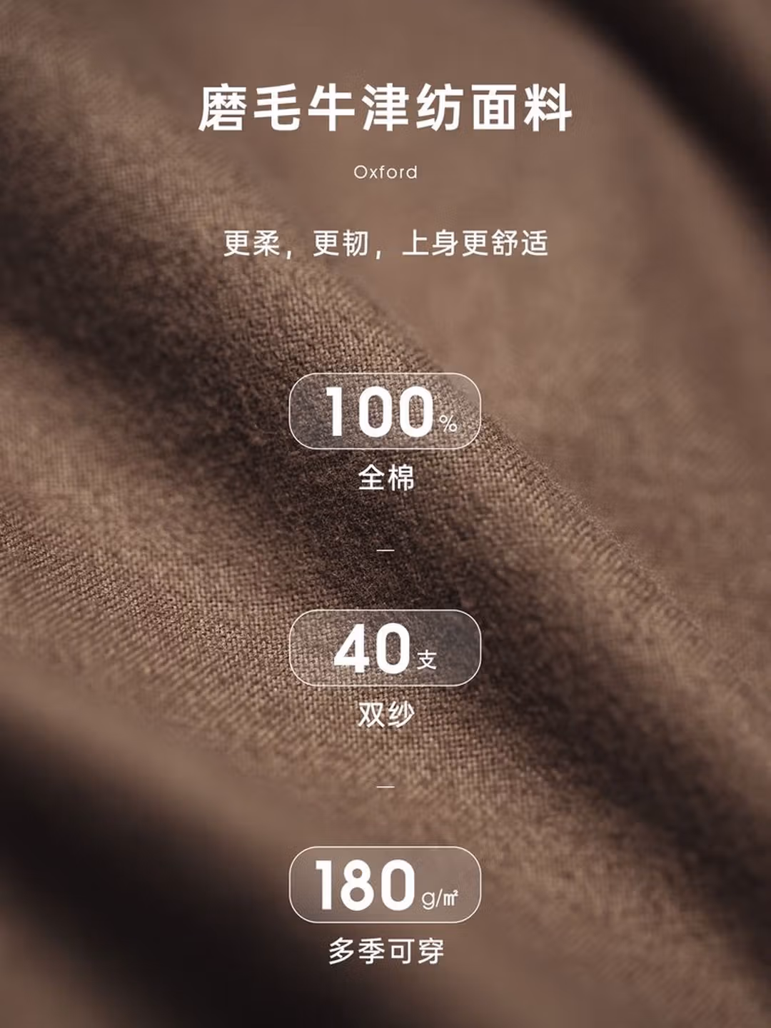 这款Maden 马登工装 26年春季新款 牛津纺衬衫 TH2601145,考虑到上身的舒适性,在经典牛津纺衬衫上做了细节改制,磨毛工艺把手感变柔和,立体精裁让版型更合身,特调四款氛围感配色:浅棕,军绿,砖红,藏青满足多种搭配需求。双股棉纱先染后织,勾勒出颗粒肌理再用磨绒,轻酵水洗工艺手感变得更柔和、更亲肤舒爽,视觉上有“雾面质感”。