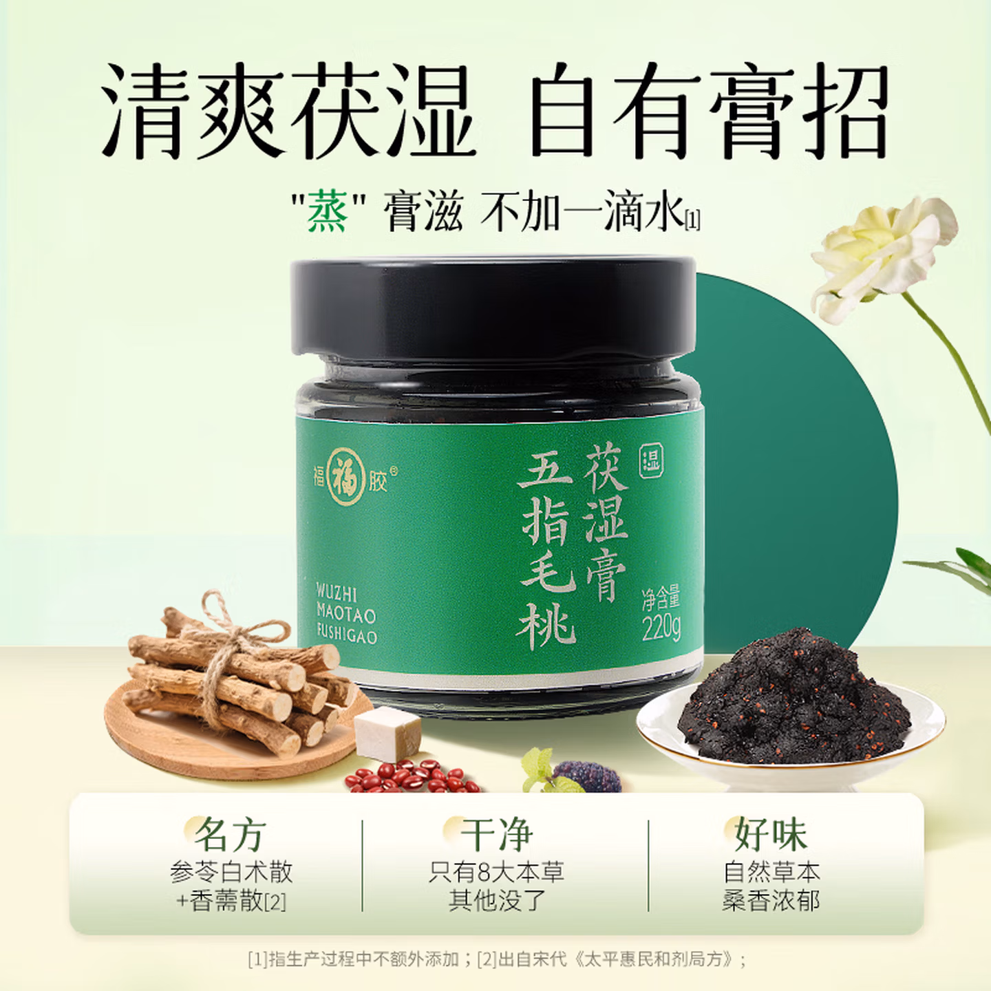 福牌阿胶五指毛桃茯湿膏220g伏湿膏茯苓桑葚陈皮 220g*1盒 新旧包装同步发货,京东商城好评率100%,现福牌阿胶药品旗舰店售价79,下单2件领取¥100京东优惠券 , 实付¥58包邮。