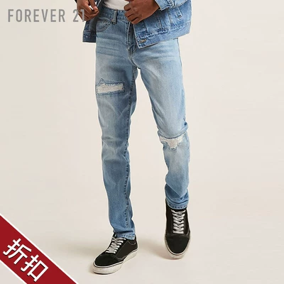 Forever21 牛仔长裤男时尚个性棉质做旧磨破破洞小脚水洗牛仔长裤 50元