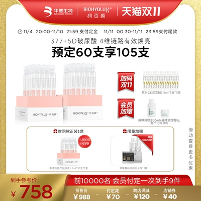华熙生物 BIOHYALUX 润百颜 蜂巢玻尿酸 净肤次抛原液,顾客评价4.8分,现天猫 润百颜旗舰店售价30支*2盒双11预售价¥818,支付定金¥100立减¥45,可领取¥40天猫优惠券,跨店满减¥90,实付¥643包邮,加赠同款30支,到手1.5ml*90支,现在还加赠黑零饮品2袋+前10000名店铺会员付定赠调理水30ml+调理霜8g。点此搜索更多天猫/淘宝优惠券。