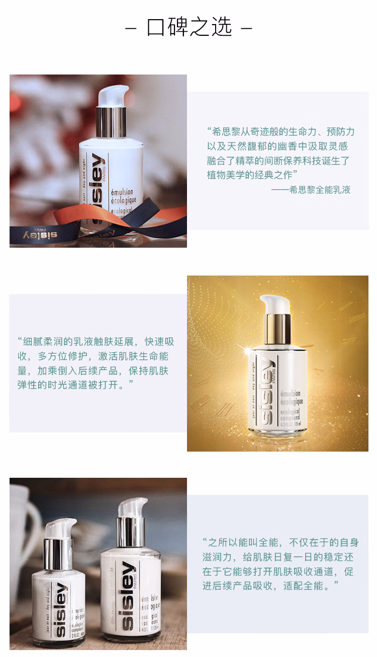 Sisley Emulsion Ecologique Day and Night Lotion 希思黎 全能乳液,是Sisley的经典之作,在Sisley希思黎的完美世界中,它是无可取代的不朽经典,自1980年问世,全能乳液即于无数经典护肤品中脫颖而出,并成为至今日依然经久不衰、风靡全球的殿堂级保养精品。