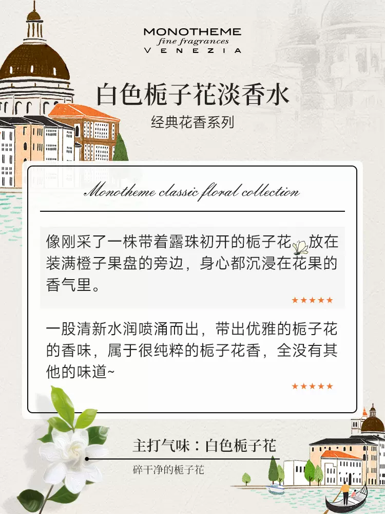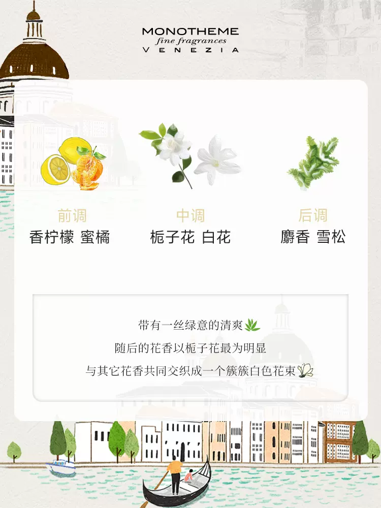 这款Monotheme 白色栀子花 淡香水 EDT ,产地意大利。超高还原了栀子花亲绽放过程的味道,从清晨带着露珠未绽放的栀子花到傍晚花朵开始慢慢发黄,从青涩转至成熟栀子香馥郁甜美,绵柔悠长,还带有一丝绿意,纯净清新自然不俗艳,让人不禁想到盛夏高中校园的感觉,白色校服墙角的栀子花,美好和香气一同环绕。