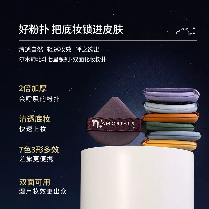 这款AMORTALS 尔木萄 北斗七星双面粉扑套盒 四枚装,灵感来源北斗七星,七色三形(圆形+尖角水滴+三角形),天枢星+天璇星+天玑星+天权星+玉衡星+开阳星+瑶光星。0.1MM气孔,细密均匀,干湿两用,上妆服帖不卡粉,打造无暇底妆。