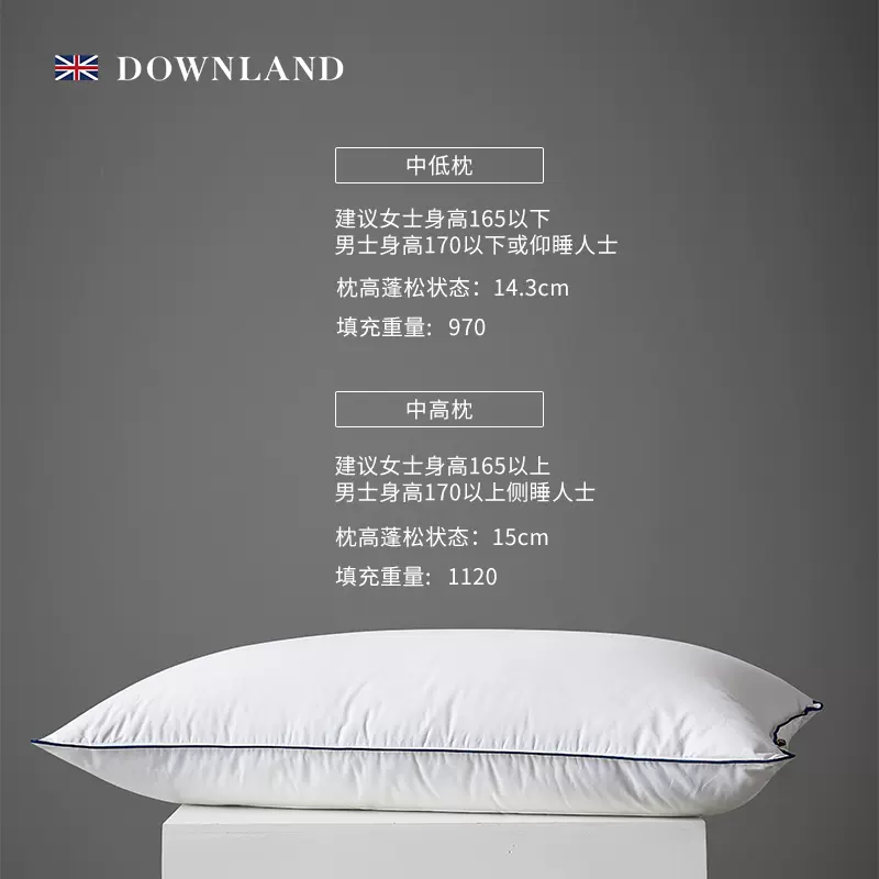 这款Downland 鹅绒鹅毛复合枕头 ,100支100%全棉面料,如睡云端的柔绵肌触感;四层独立分仓设计,层次丰富,柔软支撑,高回弹,打造四重高奢陷入式体验;95白鹅绒填充,柔软轻盈,暖软如云,整夜透气干爽;精致红蓝滚边,尽显英伦风情;科学定制枕高, 建议女士身高165以下,男士身高170以下或仰睡人士选择中低枕;建议女士身高165以上,男士身高170以上侧睡人士选择中高枕。