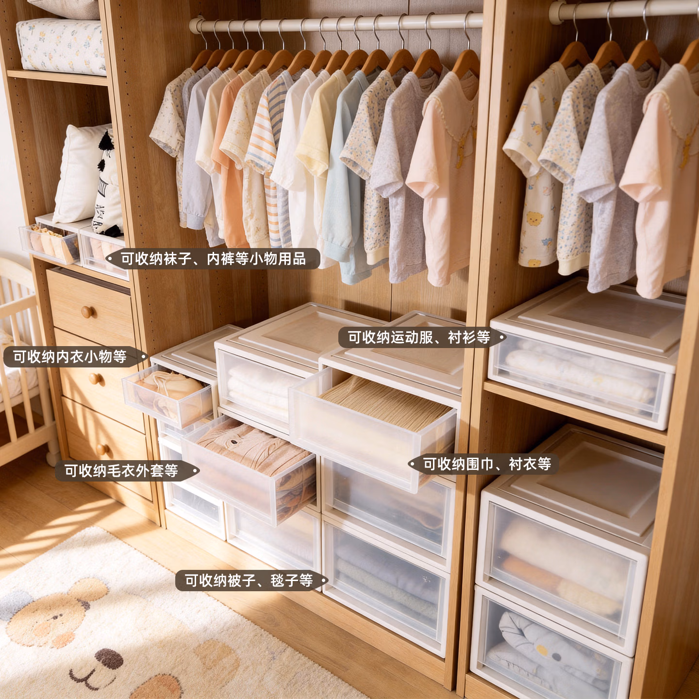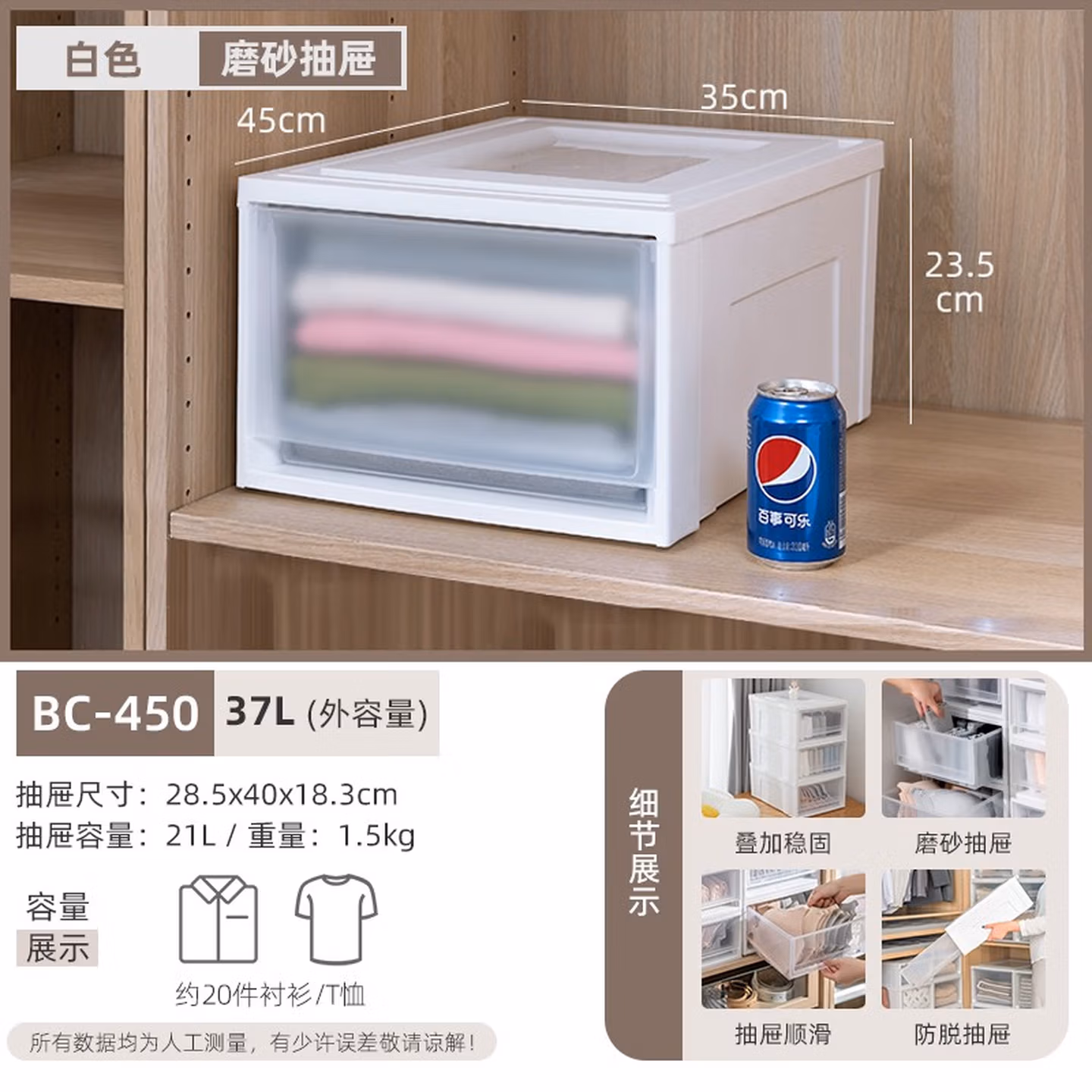 IRIS 爱丽思 BC-450 抽屉式收纳箱,精优质环保PP树脂,加厚用料,承重强。无毒、无异味,纯净度高,无杂质。边角精细处理,做工精致,造型美观,耐磨损。暗藏安全卡扣设计,抽屉稳稳贴合,杜绝抽屉脱落隐患。积木式卡槽设计,叠加稳固不易倾倒。抽屉顺滑不卡顿,随手就能拿到想要的衣物,日常穿搭更从容。收纳箱尺寸45*35*23.5cm,容量37L。