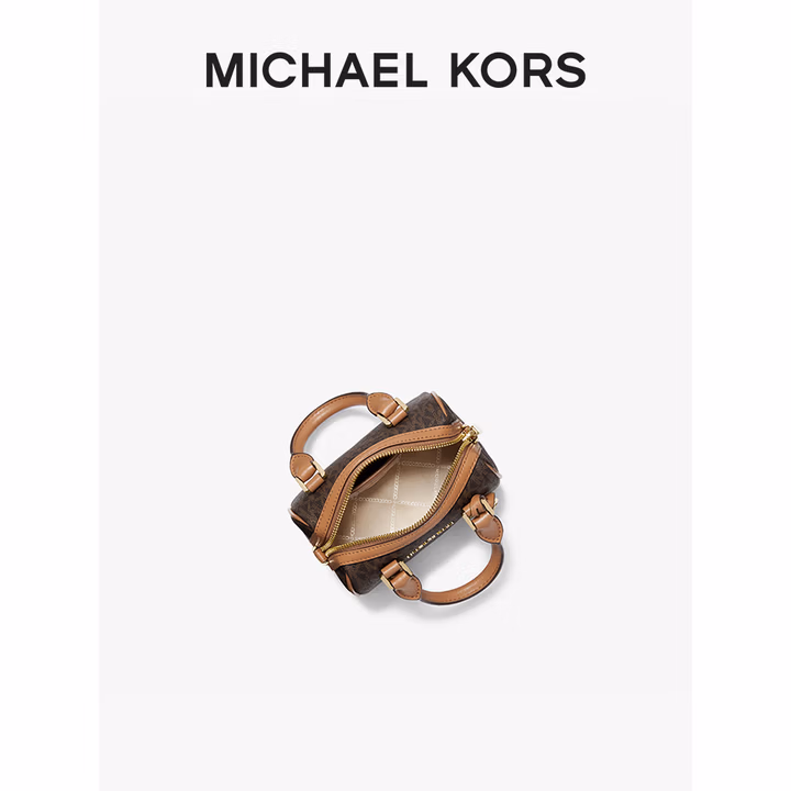 MICHAEL KORS 迈克·科尔斯 Bedford 超小号老花波士包顿手提包 32F9G06C0B, 设计别致,肩带可拆卸取下,既可斜挎在身,亦可将它作为手拿包。无论是职场通勤或周末约会,都能轻松适配,展现优雅格调。人造革+织物包身,精选 MK 品牌标志性圆形金属吊饰,提升包包整体质感与时尚感。包身搭配链带设计,金色锁扣点缀其间,为整体造型增添一抹轻盈的金属光泽,巧妙打破沉闷感。内部设有隔层,可以轻松容纳您的通勤物品。包包三围约17*10*12cm。