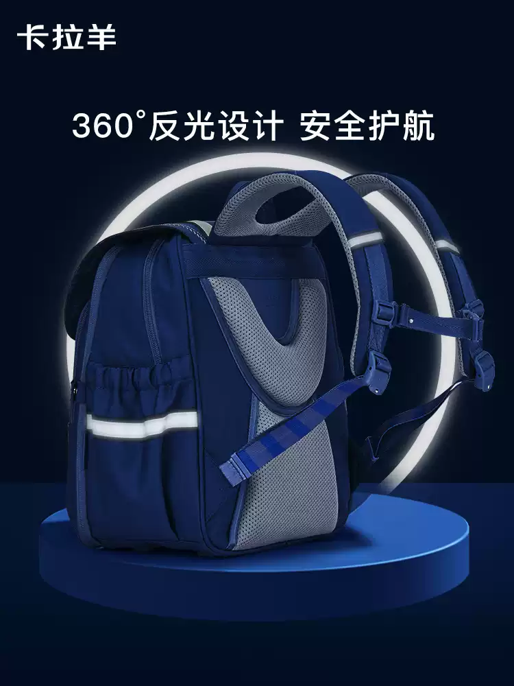 大容量主仓轻松装载,双层隔板固定书本,重心靠后减少晃动。前袋拓展储物空间,贴心收纳小物件。弹力侧袋可存放水杯和雨伞,不易掉落。卡拉羊一体式可打开专利结构,好清洗易收纳。360°反光设计,安全护航。