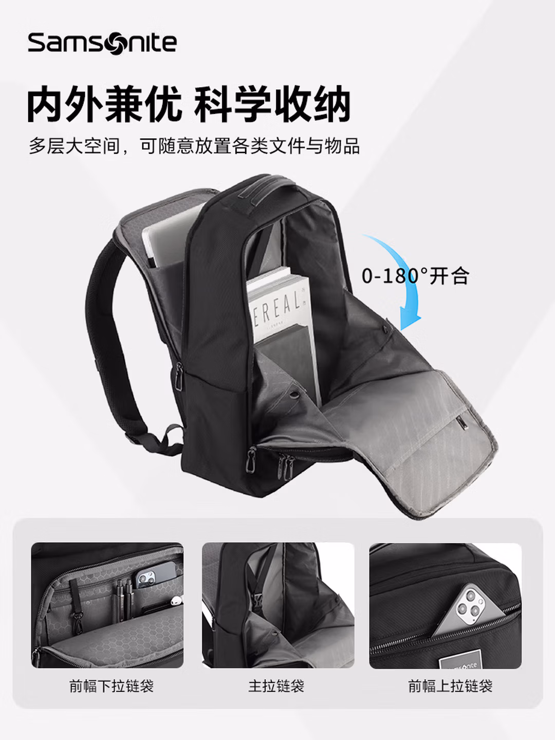 这款Samsonite 新秀丽 CHIRON系列 17英寸双肩背包电脑包 23L NU4*09005,立体挺括的包型融入简约的设计风格,轻松驾驭商务与通勤场合。多层大空间,可随意放置各类文件与物品。支持0-180°开合,伸缩式交叉绑带设计独立电脑隔层,可放置笔记本电脑和文件。