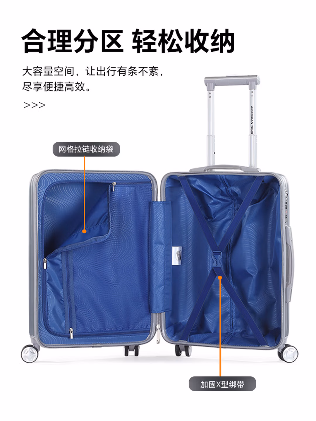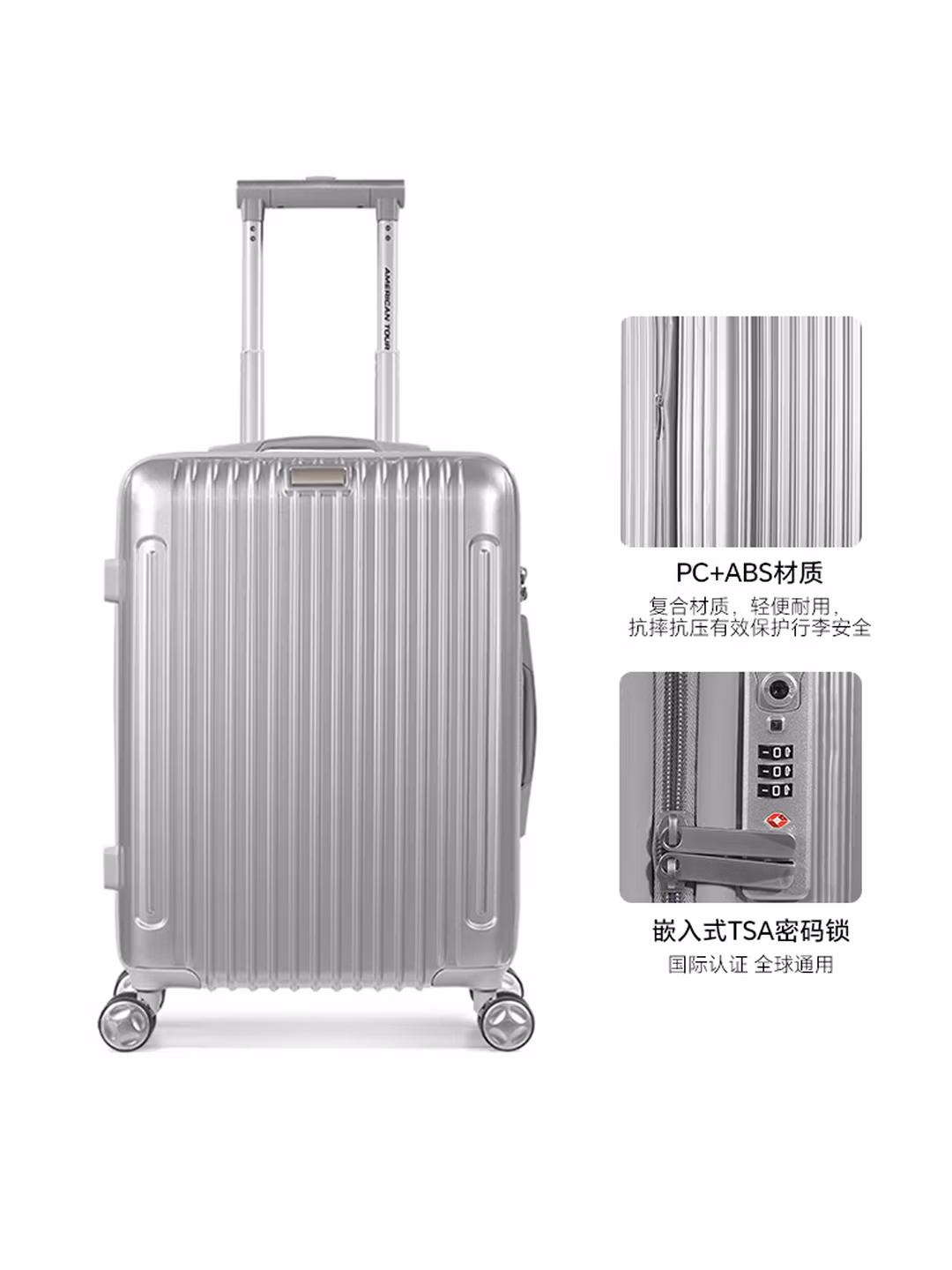 这款American Tourister 美旅 WELLINGTON系列 拉杆箱, PC+ABS材质复合材质,轻便耐用,抗摔抗压有效保护行李安全。将经典条纹融入实用设计,打造兼具美观与功能性的时尚之选 。锁具上印有TSA认证标识,全球大多数国家和地区海关均可识别并使用。 360°八轮轻音设计,轻松滑行不打扰。轻便拉杆搭配高档的全电镀把手,更显质感,使用更舒适。合理分区轻松收纳,让出行都有条不紊。尺寸410x580x240mm,容量40.5L,自重3.24kg。